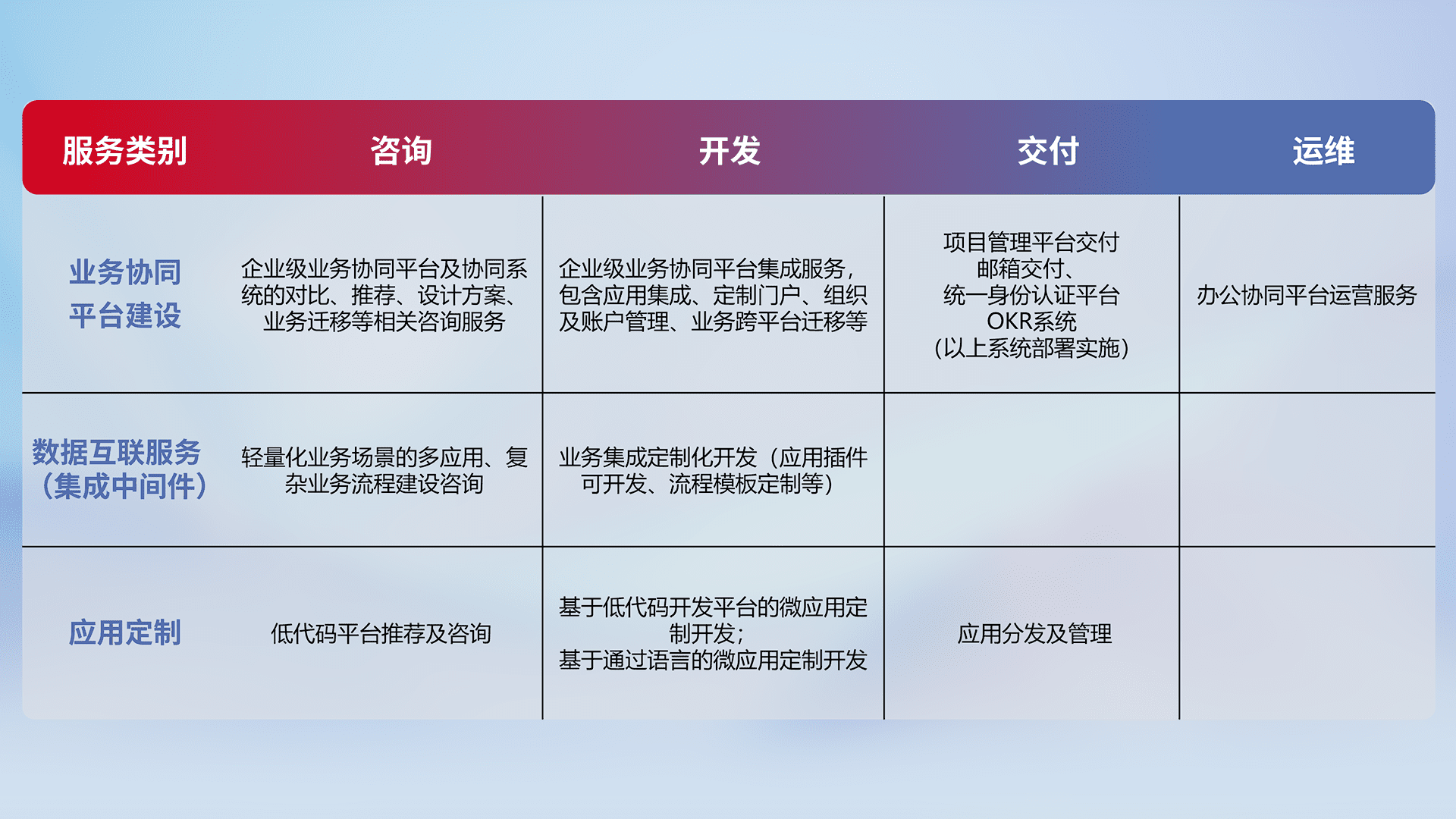针对钉钉、、企微、、、、IDaas等平台级产品提供产品的规划、、、、方案、、交付、、、定制化开发等服务,,,,实现如统一协同办公、、、、智能客户服务、、、混合会议管理、、智能数据查询、、、等业务场景,,,,实现数字化转型。。